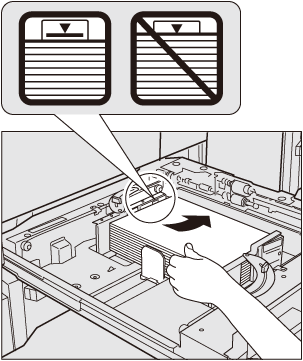 Do not load more than 500 sheets (80 g/m2 / 21 lb Bond) in the tray 1 (upper tray), or more than 1000 sheets (80 g/m2 / 21 lb Bond) in the tray 2 (lower tray). Also, do not load paper above the limit indicated on the side guide plate. Otherwise, a paper jam may be caused. Forcibly pushing the tray into the main body with paper loaded close to the limit may misalign the paper stack. Gently push the tray into the main body.