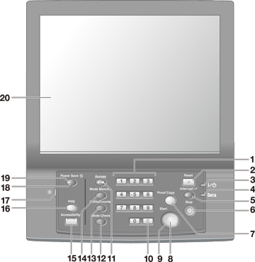 19 | Power Save LED | Lights when any power-saving mode is activated, or machine power is off due to the Weekly Timer function. |