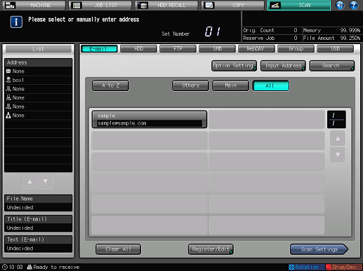 The screens of the scanning function include the screen to select addresses and the screen to configure the scan settings.