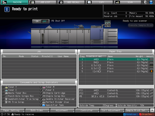 The [MACHINE], [JOB LIST], [HDD RECALL], [COPY] and [SCAN] buttons are provided at the top of the touch panel. Pressing these buttons displays the screen where you can use features corresponding to the button name. Pressing Utility/Counter on the control panel displays the [UTILITY] screen, on which you can set various machine settings.