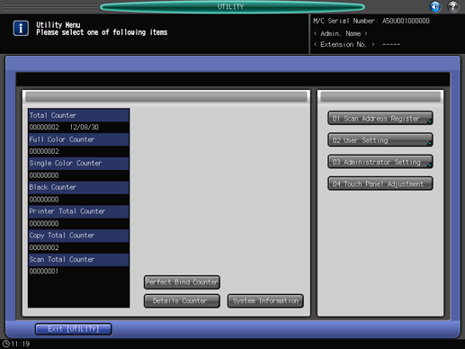 Press Utility/Counter on the control panel to display the [UTILITY] screen. The [UTILITY] screen allows you to set various machine settings.