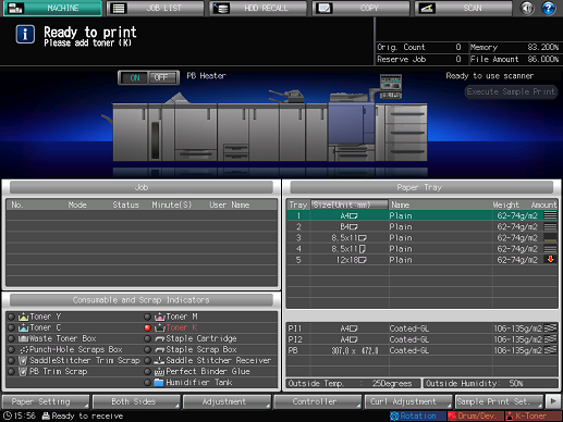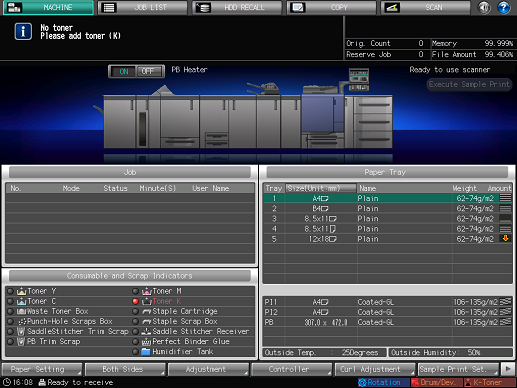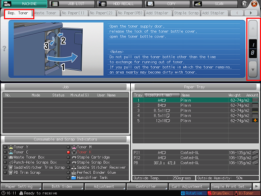 The toner color indicator to be supplied lights in red in the [Consumable and Scrap Indicators] area of the [MACHINE] screen.