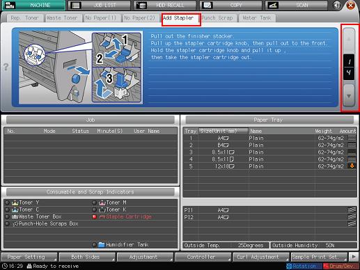 The Staple Cartridge indicator lights in red in the [Consumable and Scrap Indicators] area of the [MACHINE] screen.