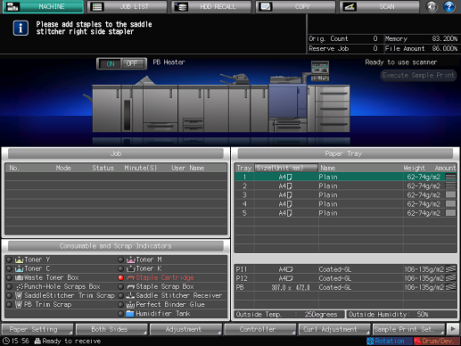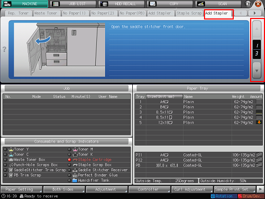The Staple Cartridge indicator lights in red in the [Consumable and Scrap Indicators] area of the [MACHINE] screen.
