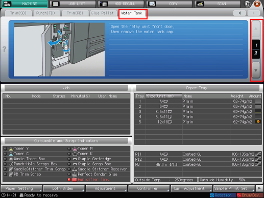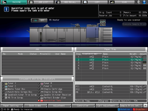 The Humidifier Tank indicator lights in red in the [Consumable and Scrap Indicators] area of the [MACHINE] screen.