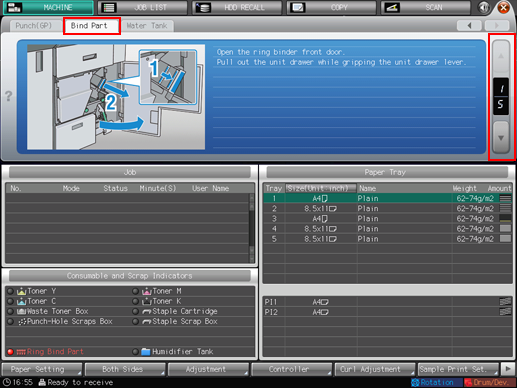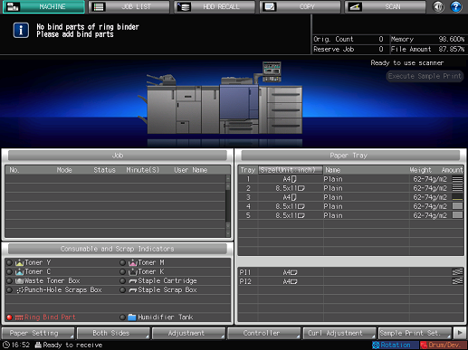 The Ring Bind Part indicator lights in red in the [Consumable and Scrap Indicators] area of the [MACHINE] screen.