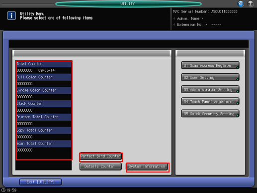 Pressing [System Information] displays the system information of the machine. Press [Close] to return to the previous screen.
