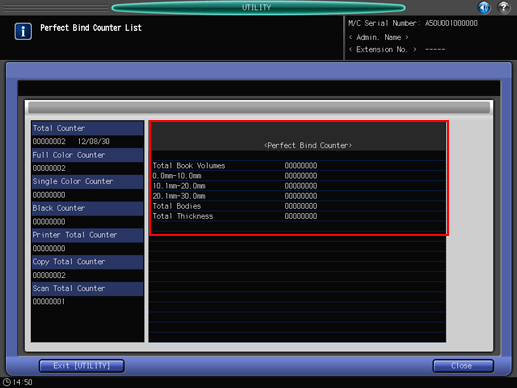 With Perfect Binder PB-503 installed, [Perfect Bind Counter] is displayed on the [UTILITY] screen and counters for the following can be displayed.