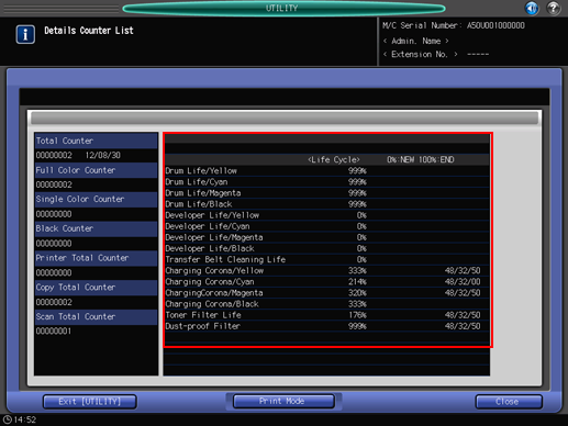The product life cycle of the drum, developer, transfer belt, charging corona , toner filter and dust-proof filter can also be checked. Information for these parts can be printed.