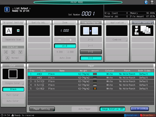 Select Simplex/Duplex, Output Setting, Paper Tray, and Paper Setting, then press Start on the control panel.
