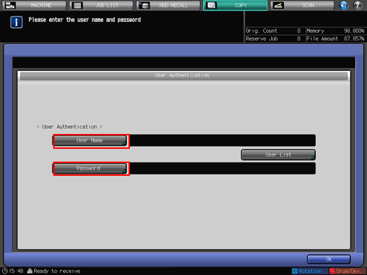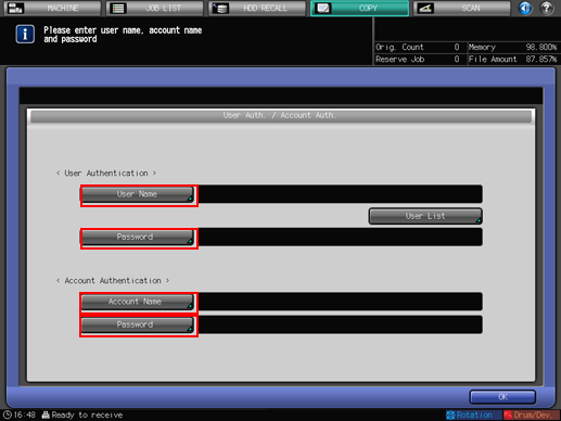 Enter the [User Name], User [Password], [Account Name], and/or Account [Password], as required. One of the five screens is displayed according to the settings on the User Auth./Account Track screen. Please follow the instruction on each screen.