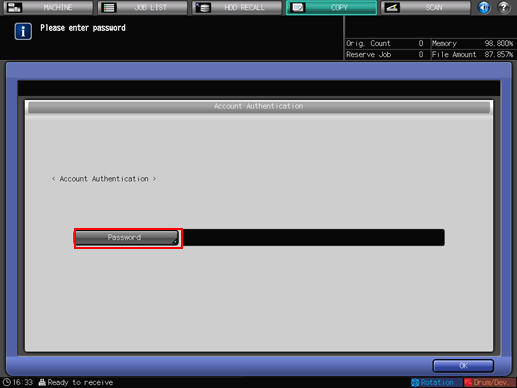 If the Enhanced Security mode is set to ON, the [User Authentication] or [Account Authentication] screen is displayed every time a user attempts to use a function that requires authentication. In this case, any password that is less than 8 one-byte characters is not authenticated. When an incorrect password is entered during authentication, users must wait 5 seconds before they can enter it again.