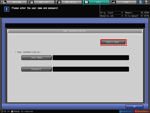 If public users are allowed to use the machine, you can use this machine as a public user by pressing [Public User] displayed on the upper right area of the [User Authentication] screen. The administrator configures the functions available for public users and the upper limit for output.