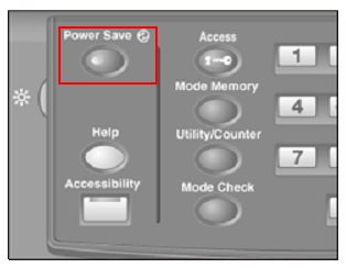 If the machine is idle for a certain period of time while being able to output, the Power Save LED lights and the touch panel turns off lowering the power consumption of the machine. The Start LED turns red, while the Power LED keeps green.