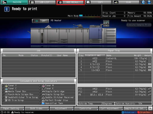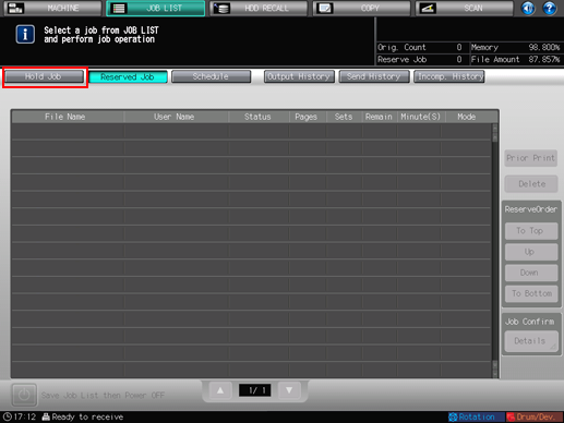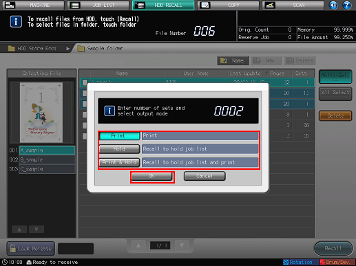To recall from the HDD root, select the job in this screen and press [Recall].