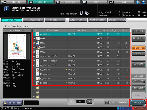 Using the touch panel of the main body or Job Centro to output a hold job / HDD saved job.