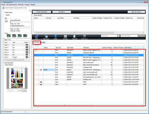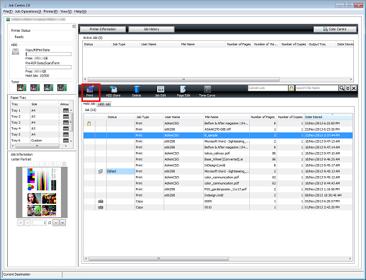 You can print a job (copy job / print job) saved/temporarily held in the HDD as necessary using the touch panel of the main body or Job Centro. It is possible to edit the print setting or the hold job on a per page basis before printing.