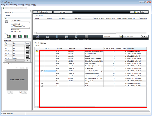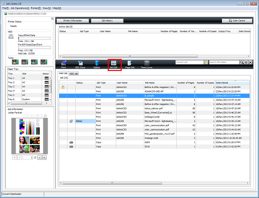 On the touch panel of the main body, you can edit both copy and print jobs. In Job Centro, you can only edit print jobs ([Job Type] is [Print]). To edit copy jobs ([Job Type] is [Copy]), use the touch panel of the main body.