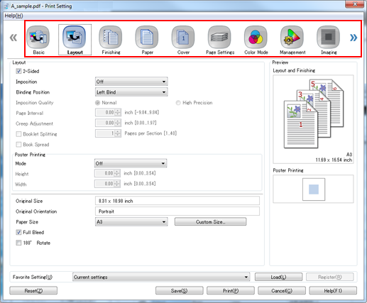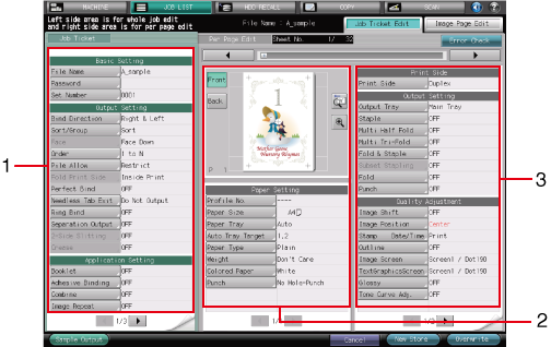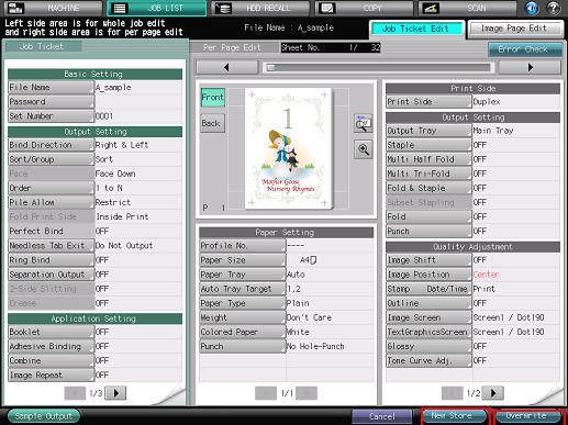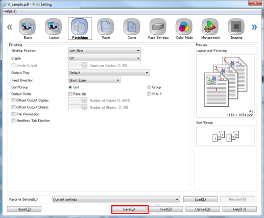 [Output Setting] | Set [Bind Direction][Sort/Group][Face][Order][Pile Allow][Fold Print Side][Perfect Bind][Separation Output], etc. | |