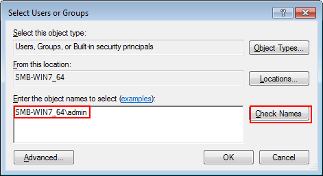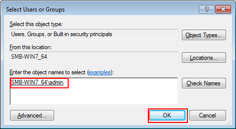[Enter the object names to select] | "SMB-WIN7_64\admin"