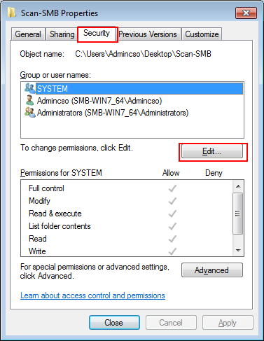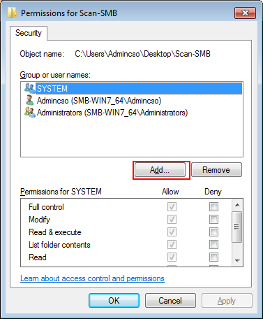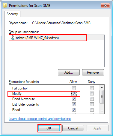 Example: Access permission is given to "SMB-WIN7_64\admin."