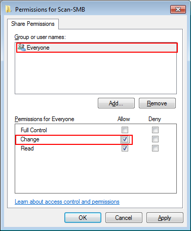 Select the group/user name to give access permission and add a check mark to [Change] of [Allow]. Click [OK].