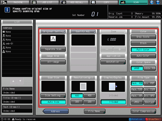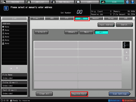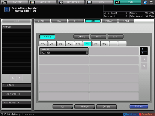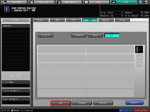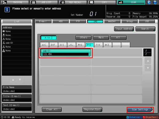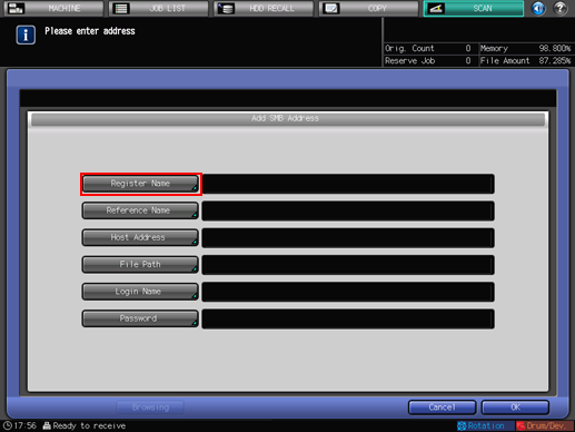 Register the destination SMB server to the machine on the touch panel of the main body.