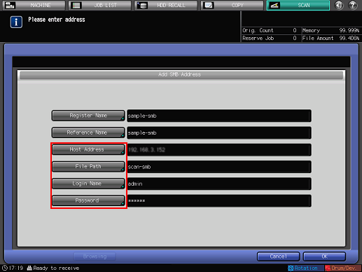 Press the [Host Address], [File Path], [Login Name] and [Password] items and enter the settings in the same manner.