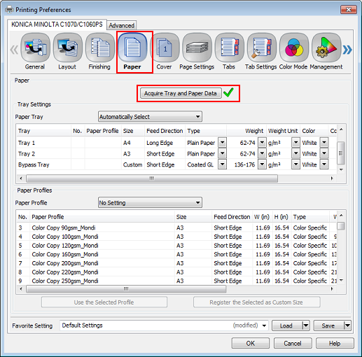 Click the [Paper] tab, and then click [Acquire Tray and Paper Data].