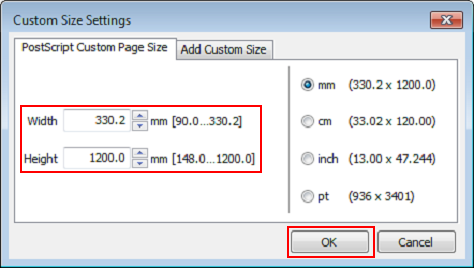 Click [Custom Size] for document size and paper size respectively, enter Width (Widthwise) 330.2mm / Width (Widthwise) 13", Height (Lengthwise) 1200.0mm / Height (Lengthwise) 47.24", and click [OK].
