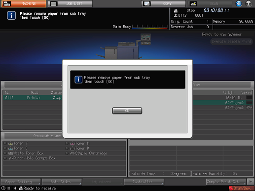 If Banner Tray Unit MK-740 is mounted on Finisher FS-531 / Finisher FS-612, every time 10 sheets are output onto the sub tray "Please remove paper from sub tray then touch OK" is displayed and output stops regardless of the paper size. Remove paper from the sub tray, press [OK] on the screen, and then press Start on the control panel to start output.