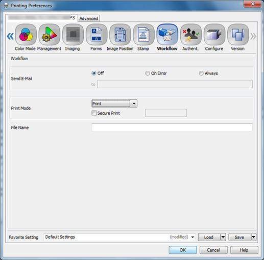 [Print Mode] | [Print], [Spool], [Hold], [Print and Hold], [Form] | Set a print method. When [Normal Print] is selected, the print job is printed without it being saved in an HDD. When [Spool] is selected, the print job is saved in the HDD in the machine temporarily, and then printed. It can prevent the intermittent printing that may be observed when printing jobs with a lot of pictures, etc. If you select [Form], you can save an image file to the image controller and use it as a background from the [Form] tab for this driver. For details about [Form], refer to Form. For details about [Save] and [Save/Print], refer to Saving a Print Job to HDD (PS Plug-in Driver). |