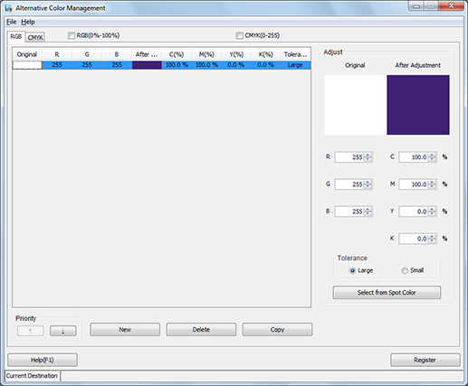 You can register in the Controller the alternative color tables saved in [Local], [My Documents], or [Network]. Alternative colors can be applied to output according to the priority of the alternative color table.