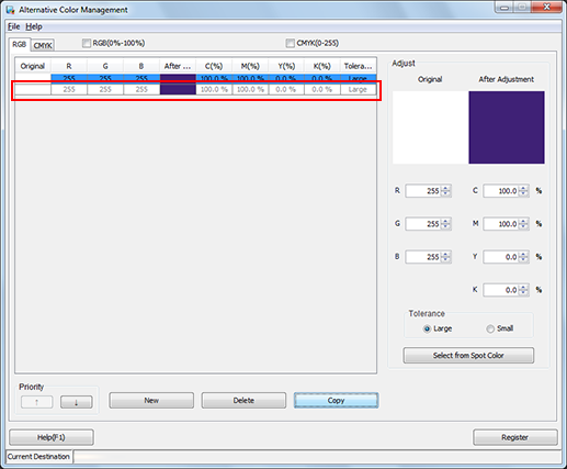 You can duplicate the alternative color settings displayed on the [Alternative Color Management] screen within the same alternative color table. When you adjust the alternative color using the existed alternative color setting, original settings of the alternative color is overwritten. When you want to save the current settings, make the duplication of it.