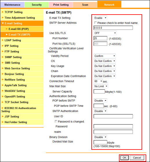Click [E-mail Setting] - [E-mail TX (SMTP)] in the [Network] tab to display this screen.