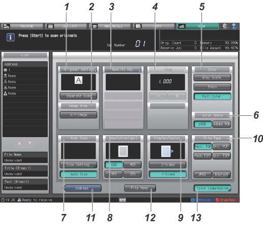 To display this screen, select or input an address, and then press [Scan Settings] on the [SCAN] screen. You can set various settings such as [Original Setting] and [Quality Adjustment].