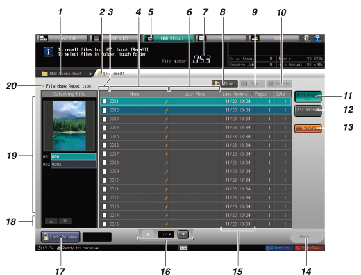 15 | [Last Update] | Displays the date when the job was stored on the HDD. Pressing the title [Last Update] will sort the list by date. |