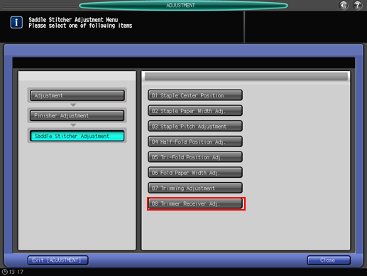 Press [Finisher Adjustment], [Saddle Stitcher Adjustment], and [Trimmer Receiver Adj.] in sequence.