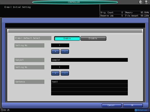 You can set initial settings for an E-mail. The set values will be used as the default values for Subject/Sentence when sending scanned data via E-mail. For details about editing subject and text, refer to [E-mail Title Setting] and [E-mail Text Setting] in Scan Address Register: Registering a Destination and a Subject and a Text of E-mail.