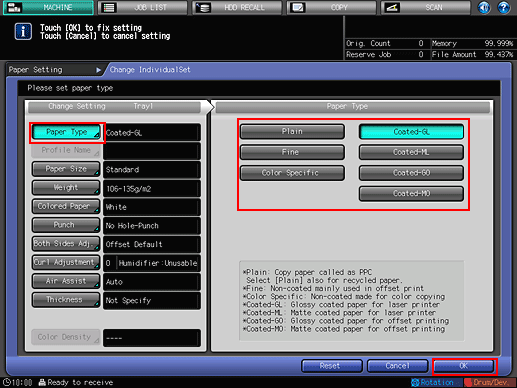 On the touch panel of the main body, press [Paper Setting] on the [MACHINE] screen.
