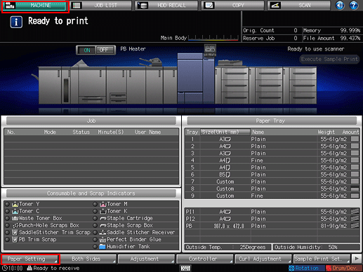 On the touch panel of the main body, press [Paper Setting] on the [MACHINE] screen.