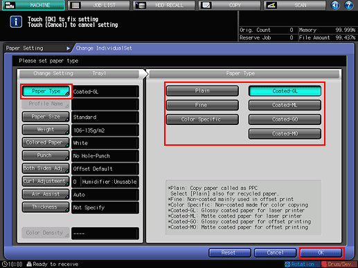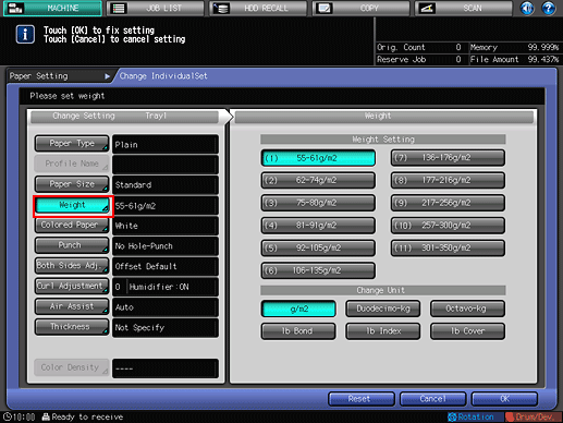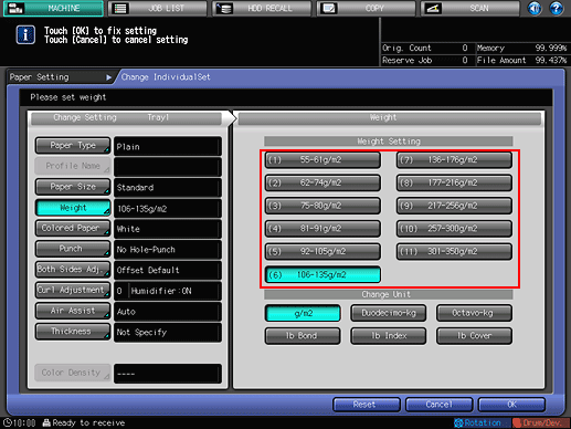 Select the applicable paper weight from the [Weight Setting] menu on the right side of the screen.