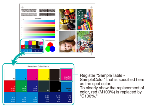 "SampleTable - SampleColor" in "Sample of Color Patch" for sample B is used as an example. Register a spot color called "Sample Color" and print out the original image with its red color replaced with "C100%."