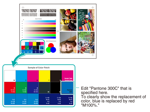 "Pantone 300C" in "Sample of Color Patch" for sample B is used as an example. The blue color in "Pantone 300C" is replaced by "M100%" for printing.