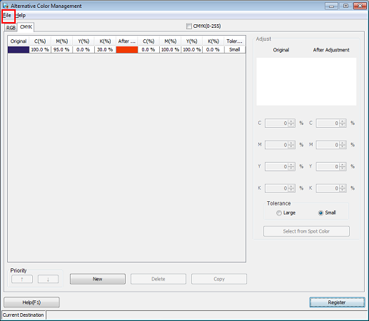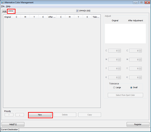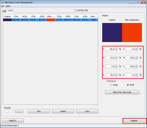 The colors being set are displayed under [Adjust]. Color in [Original] indicates the source CMYK color while the color in [After Adjustment] indicates the alternative color.