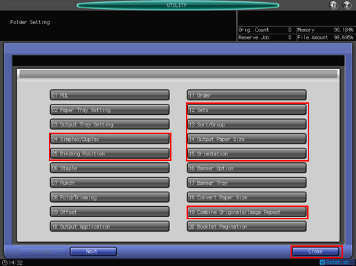 After setting the items, press [Close].