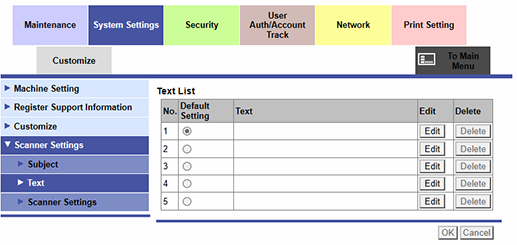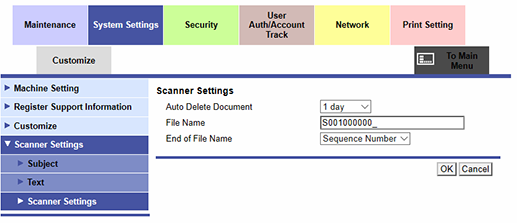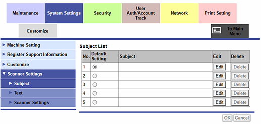 This function allows you to set the subject and text when sending scan data by email, and set the file name when saving scan data.