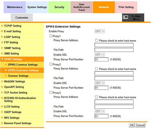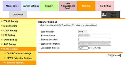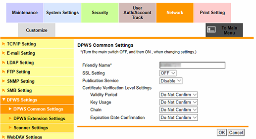 Configure various settings for the Web service function (DPWS: Devices Profile for Web Services).