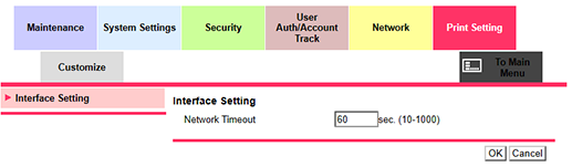 Set the communication timeout period when connecting to the network or USB-connected external storage medium.
