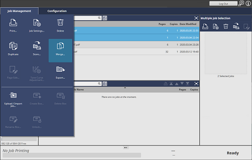Screen access | AccurioPro Print Manager - Select a job. - [Job Management] - [Merge...] | ||